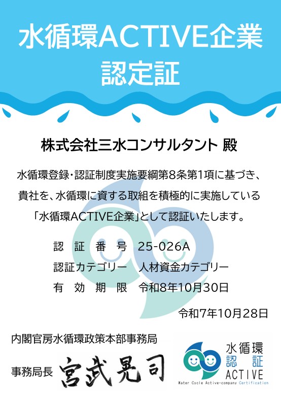 このたび当社は、内閣官房水循環政策本部から「水循環ACTIVE企業(人材資金カテゴリー)」に認定されました。